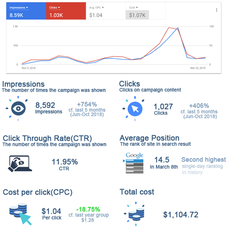 During these 5 months, we achieved a total of 8,592 impressions, 1,027 clicks (754% and 406% increase respectively on the previous 5 months) and a total spend of $1,104.72.