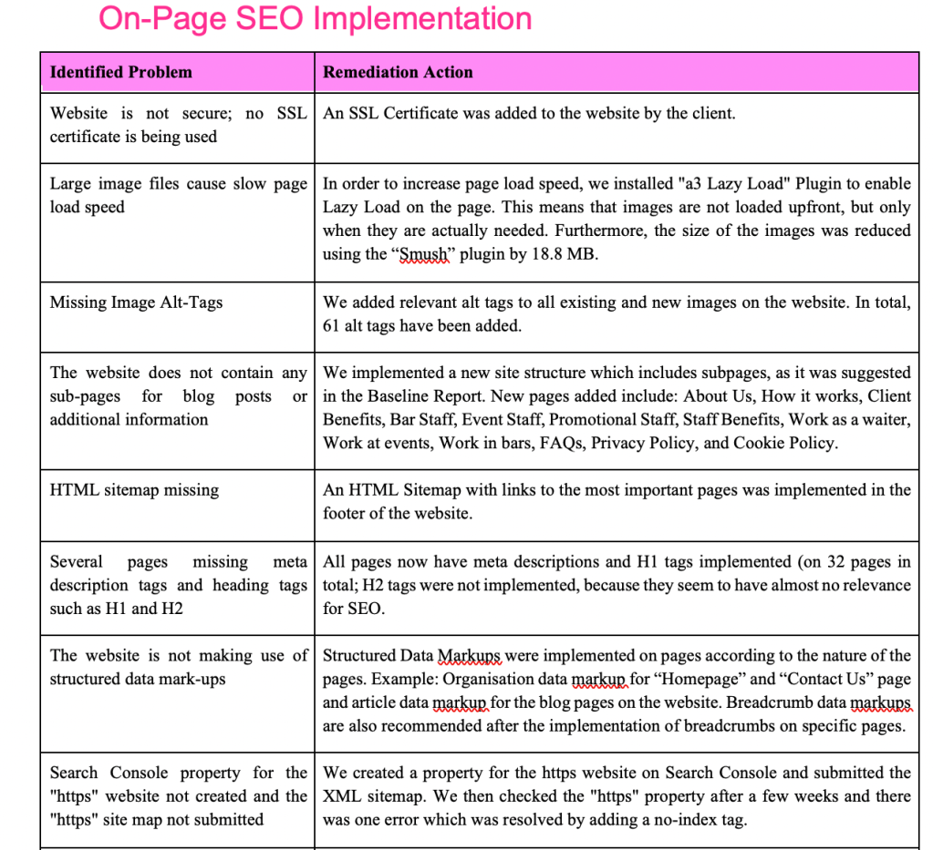 - These problems were resolved with the corresponding remediation action. This included adding an SSL certificate, image optimisation, meta-descriptions and implementing a new website structure with newly created content.